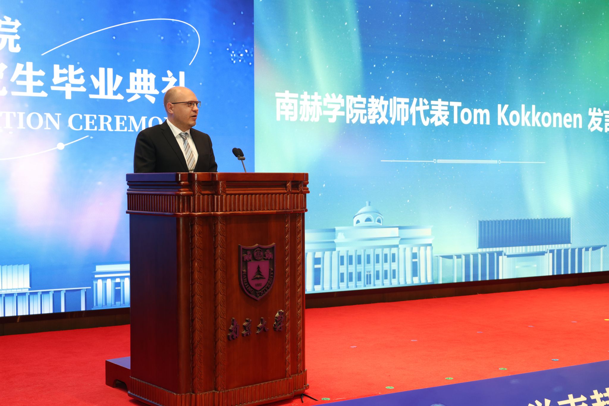 Wang Yuting and Tom Kokkonen, representing Chinese and Finnish faculties, addressed the ceremony, encouraging graduates to always maintain respect for knowledge and curiosity about the world, and uphold lifelong learning to navigate evolving environment.