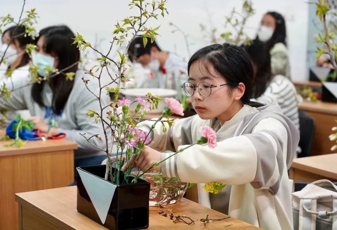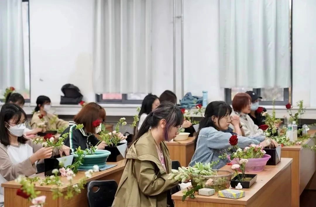 Robust and dynamic plum branches, cherry blossoms on the brink of blooming, vibrant tulips, and delicate, fresh daisies... Every Tuesday afternoon this semester, the area outside the Flower Arrangement and Creativity course classroom is brimming with an array of exquisite flowers, captivating the attention of passersby who pause in admiration.