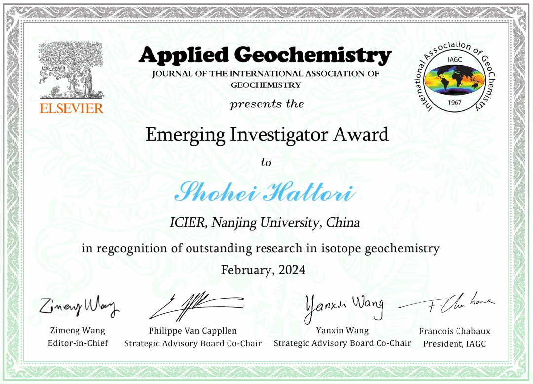 In Feb 2024, Shohei Hattori at International Center for Isotope Effects Research (ICIER), School of Earth Science and Engineeringgineering and Engineering, NJU was awarded "Emerging Investigator Award" by International Association of GeoChemistry (IAGC). His original research paper, titled “Latitudinal Difference in Sulfate Formation from Methanosulfonate Oxidation in Antarctic Snow Imprinted on 17O-excess Signature,” is featured in the Emerging Investigator Award, and has been selected as the Editor’s Choice of IAGC journal Applied Geochemistry.