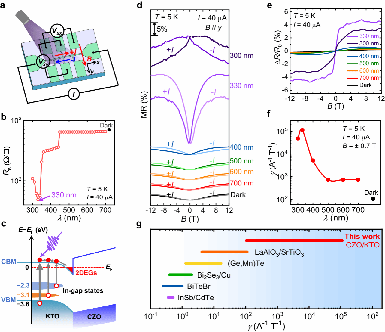 Figure 1. Light-induced giant enhancement of nonreciprocal charge transport at the CaZrO3/KTaO3 interfaces.