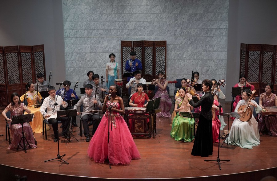 Members of the traditional instrument orchestra of China's Nanjing University perform with Kenyan singers at the University of Nairobi in Nairobi, Kenya, on April 18, 2024. (Xinhua News Agency/Han Xu)
