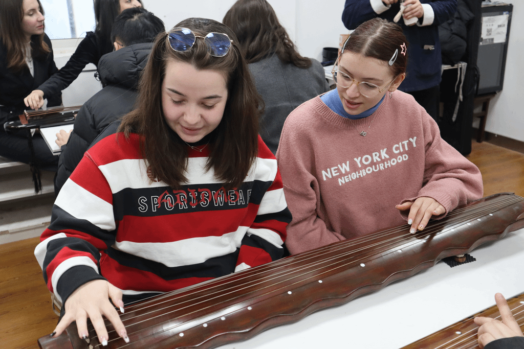 Teacher Zhou Qian first introduced the history of the Guqin, allowing the students to experience its unique sounds up close. During the session on notation and rhythm, the teachers explained how to read the simplified notation and showed the differences between duple and triple meters.