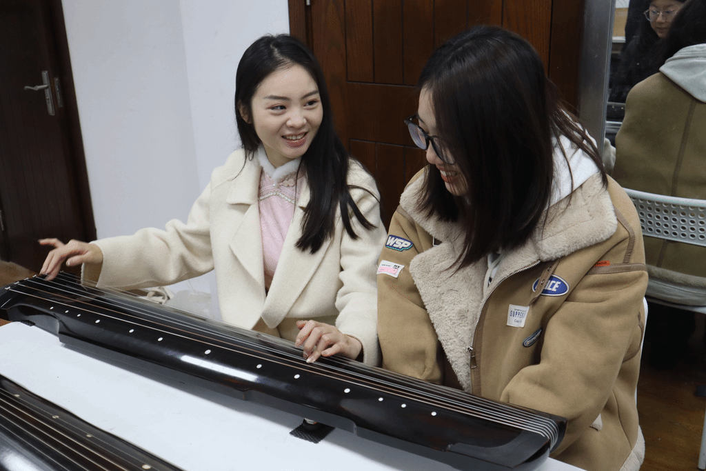 Zhou Qian, a young Guqin master, member of the Nanjing Guqin Association, and head of the Guqin Project at the Nanjing Cultural Hall's National and Folk Cultural Heritage Protection Center, along with three young Guqin artists taught the students. They guided them in exploring the 3,000-year history of the Guqin and the cultural significance of its seven strings.