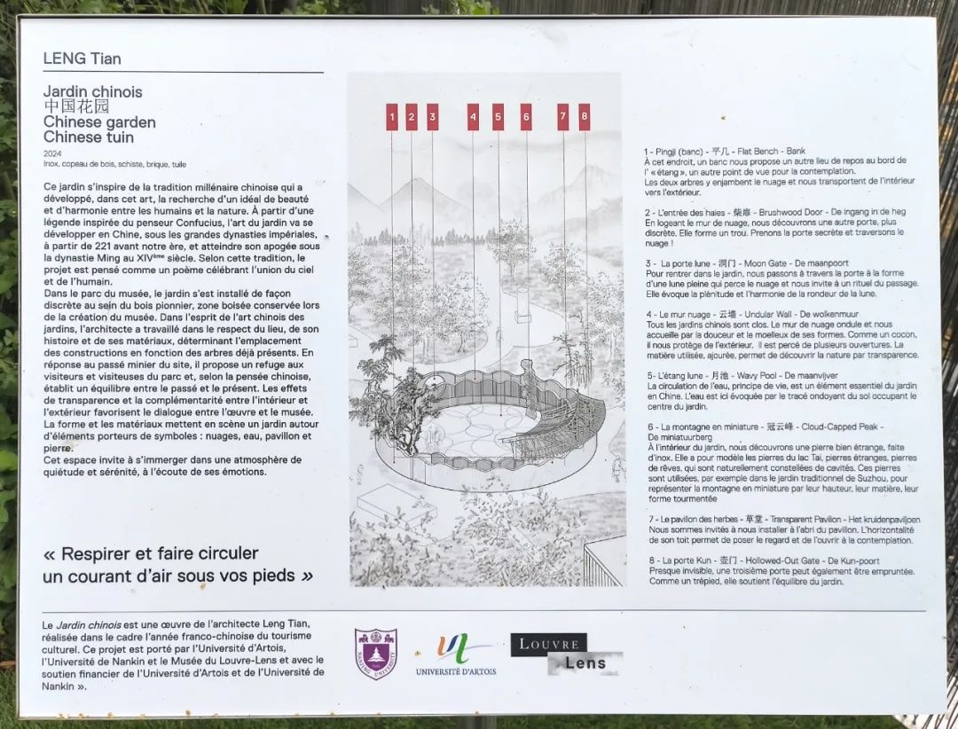 On July 5, 2024,  Parc Illumination or Ming Yuan (明苑), a Chinese-style garden, opened at the Louvre-Lens, France. Tan Zhemin, President of NJU, and his delegation attended the opening ceremony. The project is a joint effort between Nanjing University and the Université D'Artois in France for more than ten years. Designed by Leng Tian, a professor at  NJU School of Architecture and Urban Planning, the project marks the first large-scale art installation designed and built by a Chinese architect in France. It is a new symbol of cultural exchange between China and France.