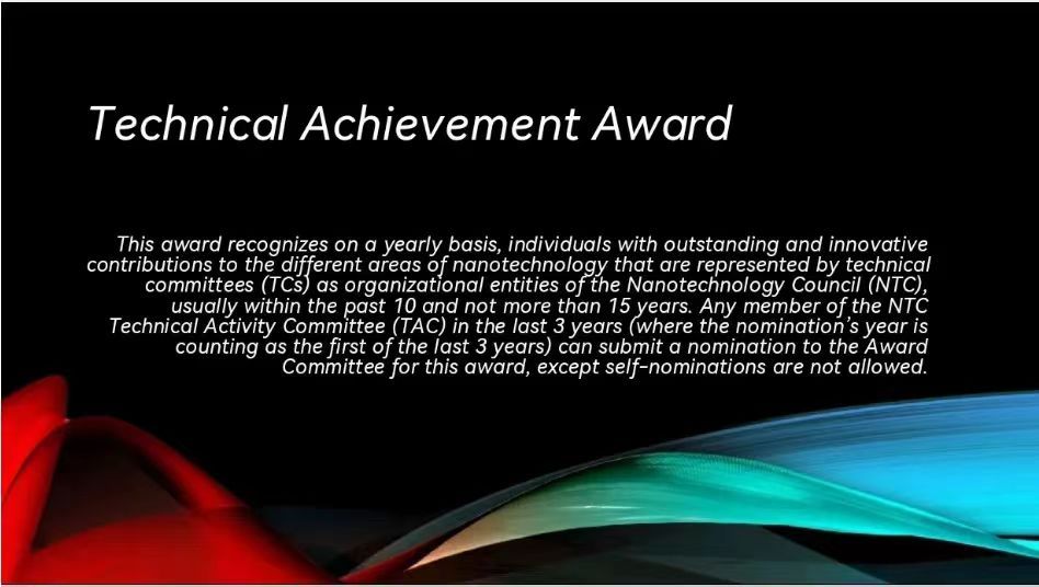 The IEEE NTC (the Institute of Electrical and Electronics Engineers Nanotechnology Council) Technical Achievement Award was established in 2022 to recognize individuals with outstanding and innovative contributions to in the field of nanotechnology. The selection criteria include the quality of their achievements, impact on the relevant field and community, and service on the Nanotechnology Council.
