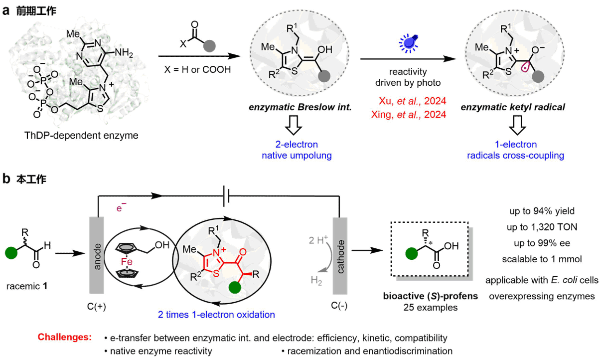 The integration of electrochemistry with enzymes has primarily been limited to replicating previously established enzyme functions. A breakthrough by Xiaoqiang Huang’s research group at the School of Chemistry and Chemical Engineering, Nanjing University, now transcends this limitation. By repurposing thiamine-dependent enzymes through ferrocene-mediated electrocatalysis, the team has unlocked a previously inaccessible dynamic kinetic oxidation of α-branched aldehydes. This robust electroenzymatic approach yields various bioactive (S)-profens with up to 99% enantiomeric excess, is applicable with whole cells overexpressing the enzyme and using down to 0.05 mol% enzyme loadings. Published online in Nature under the title "Electricity-driven enzymatic dynamic kinetic oxidation". This work opens up a new direction for asymmetric electroenzymatic catalysis.