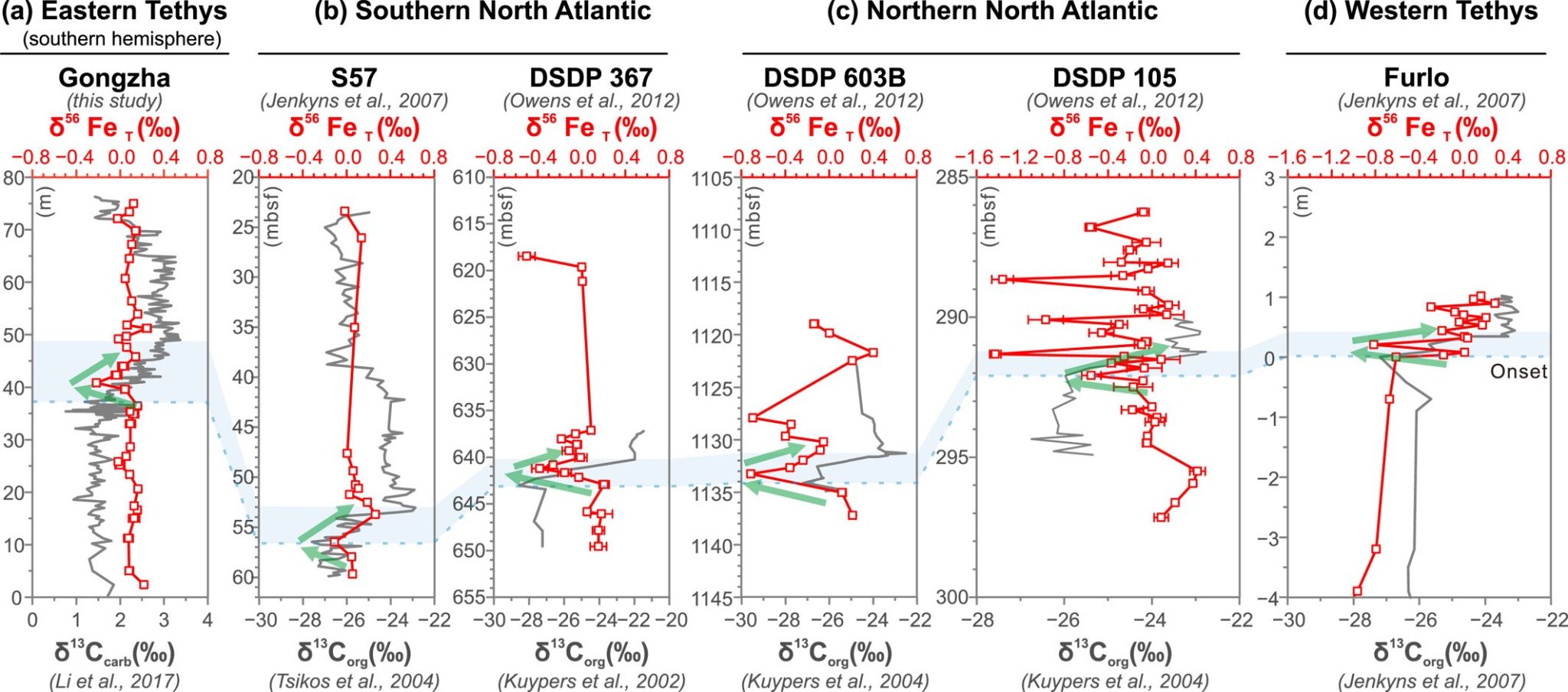 Fig. 2 Similar patterns of iron isotope variations in the initial stage of OAE2 in Eastern Tethys (a), North Atlantic (b, c) and Western Tethys (d).