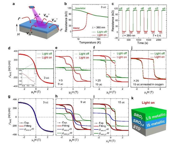 3. photoexcitation induced intermediate spin state of the substable ferromagnetic metallic phase SrRuO3-δ. (a) Schematic diagram of the optically modulated experimental device. (b) Electrical transport curves of heterojunctions with and without light illumination showing insulator-metal transition behavior. (c) Time evolution diagram of the periodic variation of transient photoresistance. (d-i) Magnetic field-dependent anomalous Hall resistance of heterojunctions of different thicknesses with and without light and their corresponding fitted curves, measured at 5 K. (j) Anomalous Hall resistance signal of annealed heterojunctions without oxygen deficiency with and without light. (k) Schematic diagram of a SrRuO3 heterojunction with all metallic features under photoexcitation.