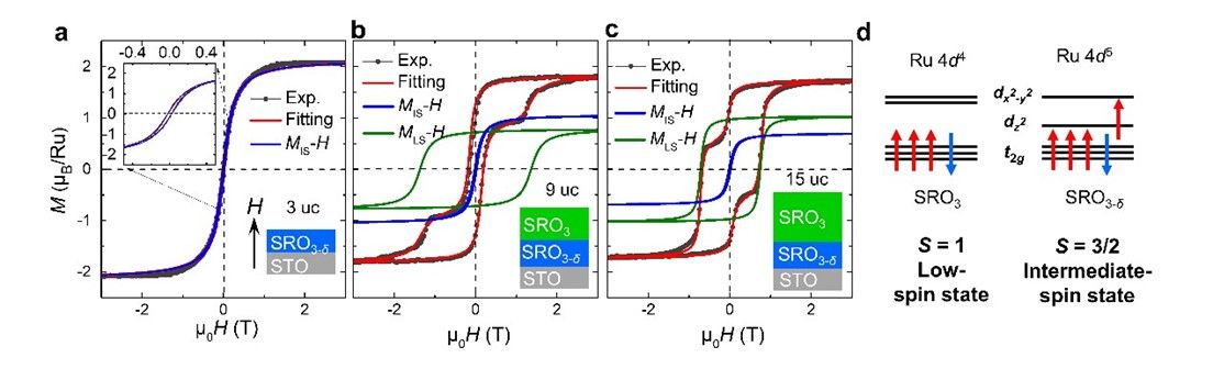 2. Ferromagnetic SrRuO3-δ ultra thin films with intermediate spin states. (a-c) Hysteresis lines and their corresponding fitted curves for SrRuO3 films of different thicknesses, measured at 5 K. (d) Orbital electronic structure with low spin state (Ru 4d4) and intermediate spin state (Ru 4d5).