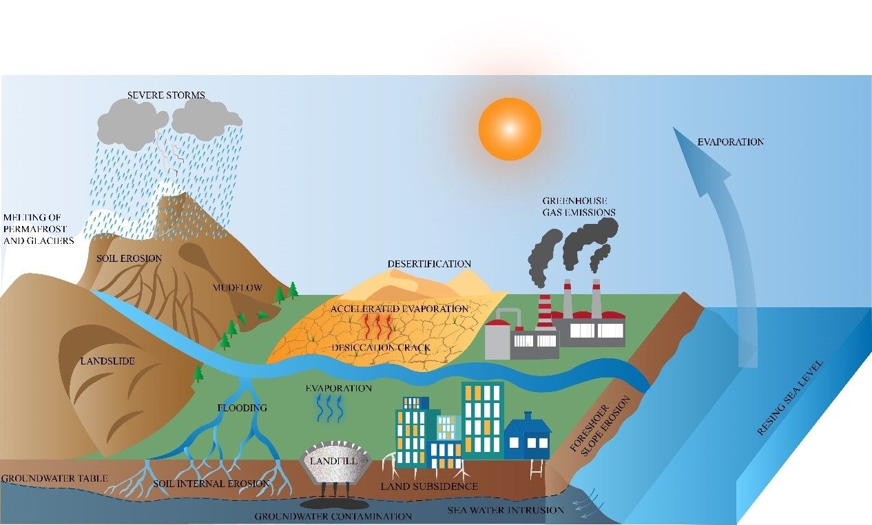 China is one of the countries with the most severe extreme climate events and disasters in the world. According to the Intergovernmental Panel on Climate Change (IPCC, 2021), global climate change has caused dramatical increase in the frequency, intensity, impact range and duration of various extreme climate events, such as heavy rainfall, long-term drought, low-temperature cold waves or high-temperature heat waves that occur once in many years. These extreme climate events will significantly change the engineering properties of surface soil through a series of material and energy exchanges, leading to serious deterioration of engineering geological conditions, thereby inducing various extreme geological disasters and ecological and environmental problems (Figure 1). And such extreme climate events also bring many new challenges to current engineering geological research and major engineering construction, seriously restricting the sustainable development of social economy.