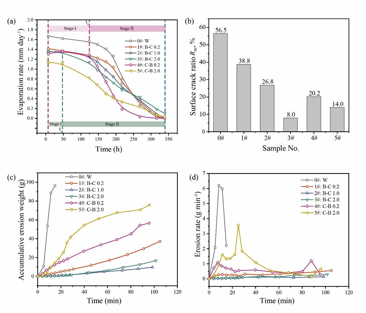 Figure 3. Variations of soil properties after microbial treatment: (a) evaporation rate; (b) surface crack rate; (c) cumulative soil loss; (d) soil erosion rate.