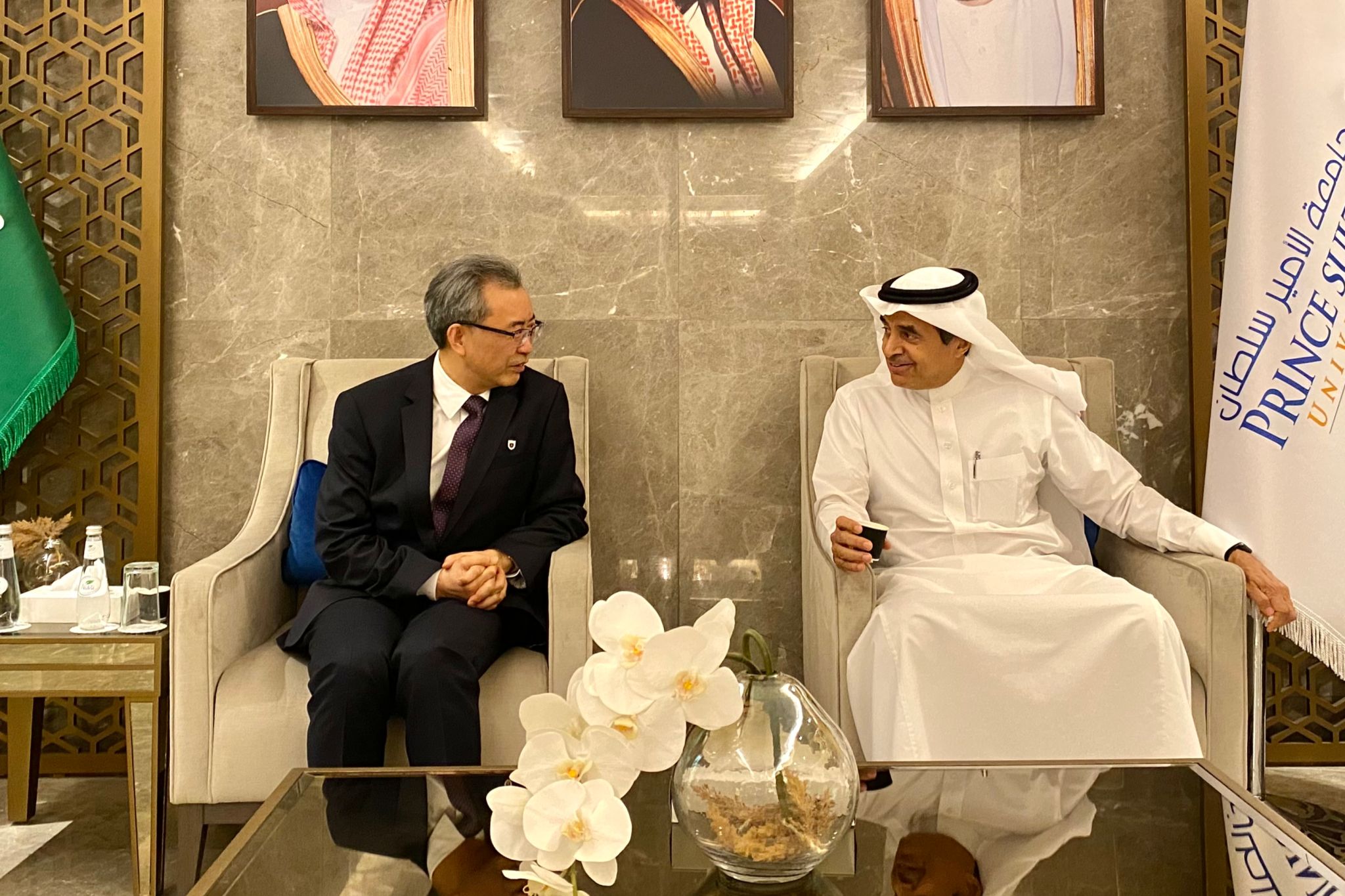 On the morning of May 3, Tan Zhemin and his delegation visited King Saud University, the oldest and largest comprehensive university in Saudi Arabia. Tan introduced NJU's history, preponderant disciplines, and recent achievements in international cooperative education. He emphasized that as China and Saudi Arabia further deepen their comprehensive strategic partnership, NJU places great importance on international cooperation under the "Belt and Road" initiative. He suggested that both sides could sign a framework cooperation agreement to promote practical collaboration and contribute significantly to technological innovation and economic development in both countries. Abdullah Al-Salman, President of King Saud University, warmly welcomed the delegation and expressed hope for establishing a friendly partnership with NJU to cultivate high-level talents with an international perspective for both countries. Nasser Aldaghri, Vice President of King Saud University, and Mezyad Alterkawi, Director of the International Office, participated in the discussions and exchange activities.