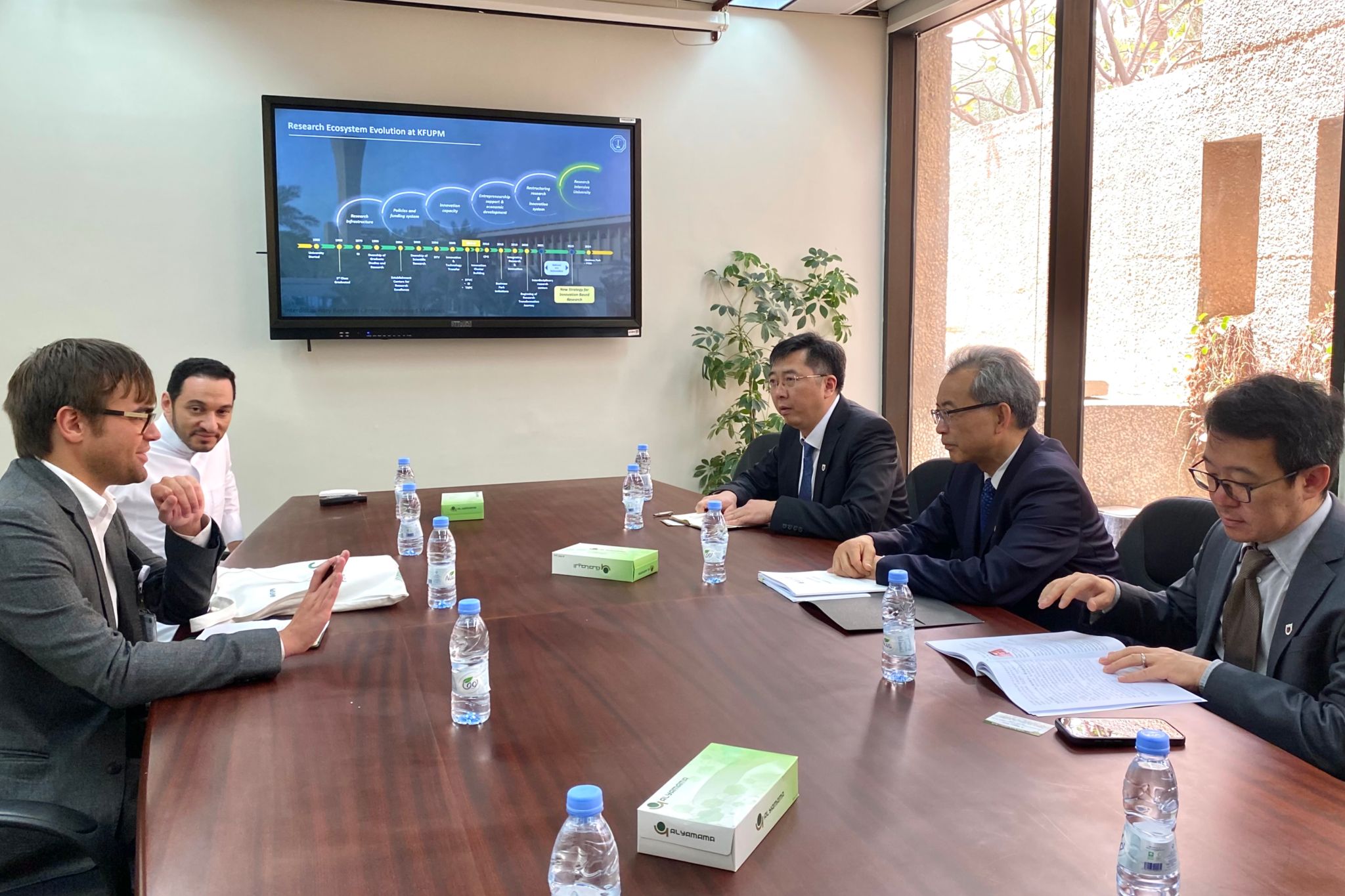 On the morning of May 5, Tan Zhemin and his delegation visited King Fahd University of Petroleum & Minerals, meeting with President Muhammad Al-Saggaf, Vice President for Academic Affairs Mesfer M. Al-Zahrani, and Vice President for Research and Innovation Affairs Ali Al-Shaikhi. Tan expressed gratitude for their warm reception and introduced Nanjing University's history, achievements, and key cooperation areas. He noted the university's impressive performance and international reputation, especially in petroleum engineering and earth sciences, and expressed hope to deepen cooperation. Al-Saggaf highlighted the university's recent achievements in technological innovation, academic rankings, and international collaboration, stating that NJU's visit laid a solid foundation for further personnel exchanges and research cooperation. During the visit, the delegation also toured the university's interdisciplinary research center and the Artificial Intelligence and Data Analysis Center.