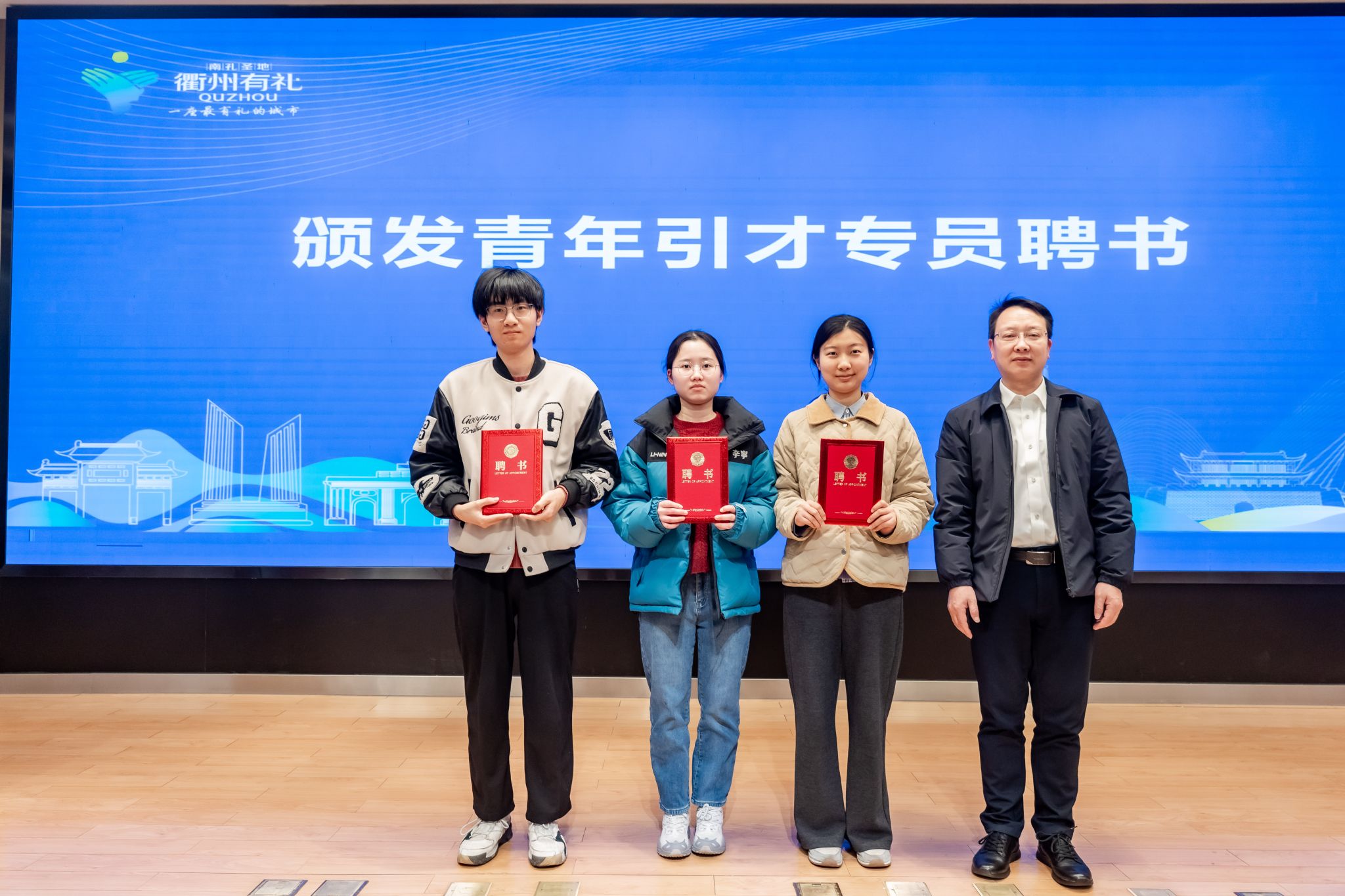 衢州市人社局党委书记、局长徐惠文为衢籍凯发k8官网在读学生钟郑起航、李想、郑瀚颁发青年引才专员聘书。