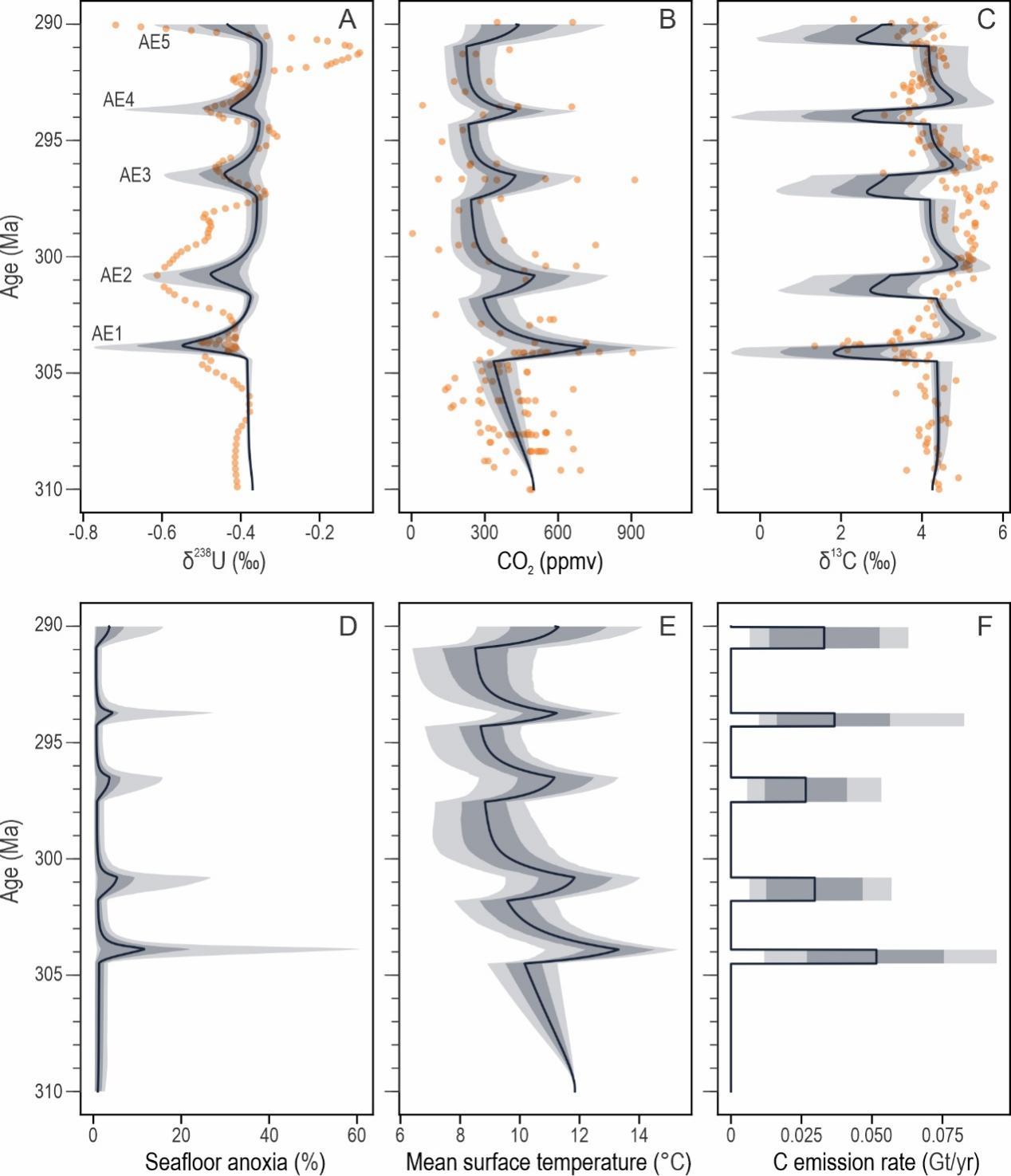 尽管此时大气—海洋整体氧化水平很高,但间歇性的巨量碳排放也可以引起重复发生的气候变暖和海底缺氧,导致全球海洋缺氧面积扩张至4%—12%,甚至可能导致海洋生物多样性停滞或下降。