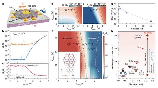 图3. MoS2/SiP2异质界面栅极可调的各向异性电学特性。(a)双栅调控的1L-MoS2/SiP2场效应器件示意图。(b)1L-MoS2在背栅为20 V条件下不同方向电导的转移特性曲线(扫描顶栅)。(c)电导各向异性指数随栅极栅压的变化。(d,e)不同方向电导随顶栅和底栅的函数关系。(f)电导各向异性指数随顶栅和底栅的函数关系彩图。(g)MoS2/SiP2器件电导各向异性指数随MoS2厚度的函数。(h)不同层状材料中电导各向异性指数的总结图。