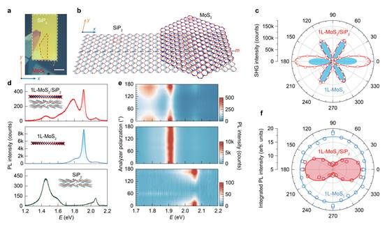 图2. 1L-MoS2/SiP2界面的各向异性光学响应。(a,b)1L-MoS2/SiP2异质结构的光学照片(a)和俯视示意图(b),其中MoS2的扶手椅方向与SiP2的x方向平行。比例尺为20 μm。(c)平行配置(起偏器和检偏器极化方向平行)下1L-MoS2(蓝色)和1L-MoS2/SiP2(红色)的偏振依赖的二次谐波产生(SHG)强度。(d)77 K时SiP2、1L-MoS2和1L-MoS2/SiP2异质结构的荧光(PL)光谱。(e)对应的PL强度随光子能量和偏振方向变化的二维彩图。(f)1L-MoS2和1L-MoS2/SiP2异质结构偏振依赖的PL强度。