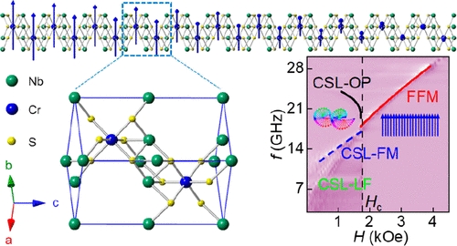 图1. 单轴手性螺旋磁体CrNb3S6的晶体结构(左)和自旋结构示意图(上);四类自旋动力学模对应的f vs. H铁磁共振谱(右)