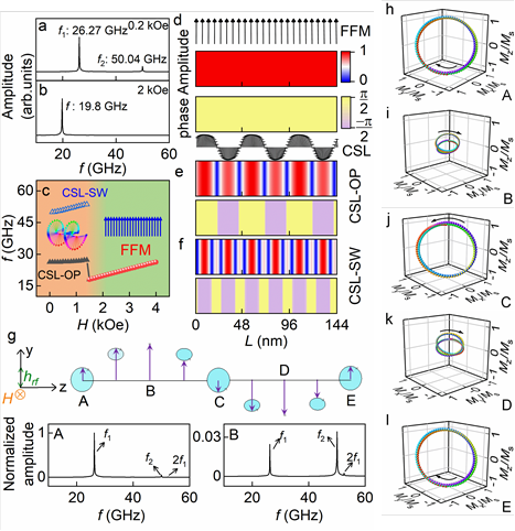 图2. 微磁学模拟结果。低场手性孤子晶格态 ? = 0.2 kOe(a)和高场铁磁态 ? = 2 kOe(b)下计算的频谱;(c)模式的f-H色散;(d)H = 2 kOe下,铁磁共振模FFM(e-f)H = 0.2 kOe下的光学模CSL-OP(e)、高阶驻波模CSL-SW(f)的归一化强度(红蓝色标度)和相位(黄紫色标度)的空间分布;(g)沿c轴旋转一个完整手性磁孤子周期内几个典型位置处的自旋共振的磁化快照;(h)-(l)分别为(g)中A(h)、B(i)、C(g)、D(k)、E(l)点自旋在0.8 ns内的详细振动轨迹图(按照红色-紫色的顺序进动)。