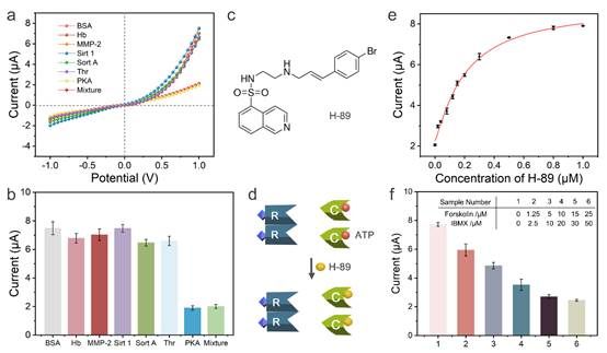 为了进一步验证他们所研制的生物传感器的性能,研究团队进行了一系列实验证明其具有良好的特异性与抗干扰性。他们还通过对PKA抑制剂的预处理实验证明了生物传感器在筛选PKA抑制剂方面的潜力。最后,研究人员发现该生物传感器在体外测定细胞裂解液中PKA活性方面表现出色(图3)。