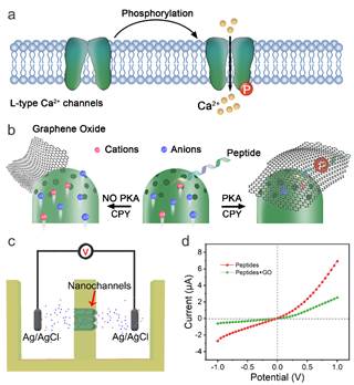 李根喜教授团队之前在功能化纳米通道中离子传输调控方面开展了许多工作(J. Am. Chem. Soc. 2019, 141, 8239–8243; Anal. Chem., 2021, 93: 16646-16654; Nano Lett. 2022, 22, 1083–1090),为本项技术研究提供了基础,因而成功实现了对纳米通道空间位阻和润湿性的同时调控,并构建了一个可以被PKA催化磷酸化调节的仿生离子门控(见图1)。研究团队模拟了PKA调控的L型钙离子通道的过程,并巧妙地运用响应肽作为PKA特异性磷酸化靶点,因此多肽在磷酸化状态下避免了被蛋白酶消化,从而成为氧化石墨烯与纳米通道的理想纳米粘合剂。这一巧妙设计产生的空间位阻和润湿性的巨大变化显著地阻碍了离子传输,而未经磷酸化的纳米通道则容许离子的自由运输。