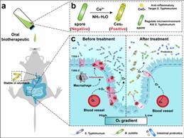 急性肠胃炎通常是由肠道病原菌如沙门氏菌引发的肠道感染性疾病,病理特征包括ROS水平升高、氧气含量增强、肠道菌群失衡、肠屏障受损等。抗生素疗法(如左氧氟沙星)被广泛用于对抗沙门氏菌,但是往往会加剧肠道菌群失调和损害肠道粘膜屏障功能。益生菌疗法能够抑制沙门氏菌定植同时调节肠道菌群平衡,然而有限的靶向能力和较低的ROS清除活性阻碍了其治疗潜能。