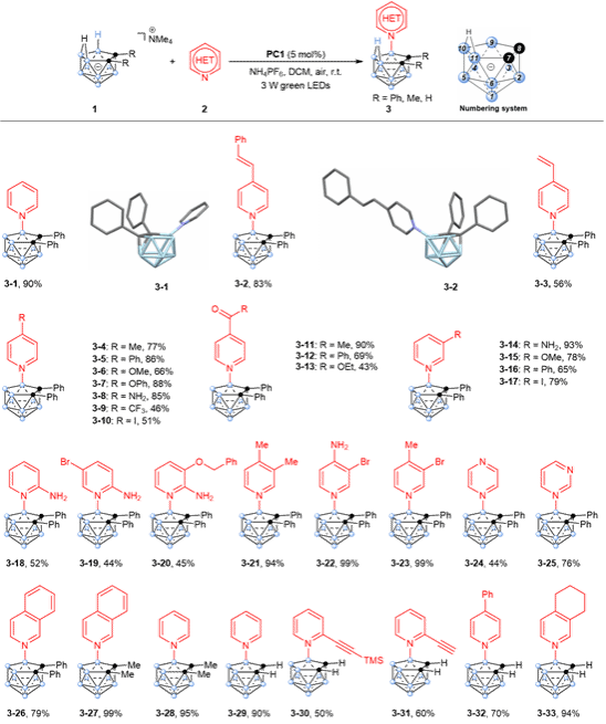 基于以上机理的理解,作者对不同巢式碳硼烷和吡啶衍生物(吡啶,嘧啶,吡嗪,喹啉等)进行了底物拓展,以中等至优秀的产率得到了一系列B–N偶联的碳硼烷基产物,反应位点单一选择B(9)位点(图4)。