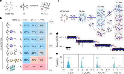 图1 单分子电信号实时原位跟踪蛋白质纳米孔道内逐步化学反应修饰进程.