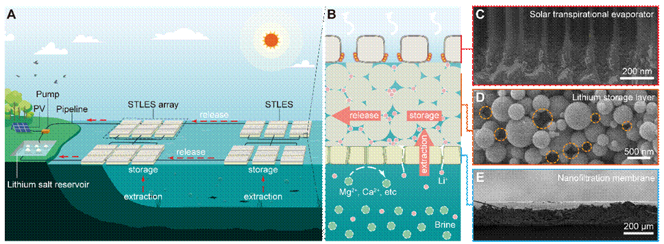 受此启发,凯发k8官网研究团队成功开发了界面光热盐湖提锂装置(STLES)。其结构和工作原理如图1所示,主要包括三部分:(1)界面光热蒸腾作用在蒸发器纳米通道(图1C)内产生超高毛细压强;(2)该毛细压强传递至离子分离层(图1E),驱动锂离子选择性从盐水进入储存层;(3)通过水循环系统收集储存层(图1D)中富集的锂盐,并实现装置再生。