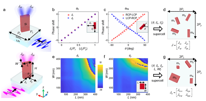 该工作首先在铌酸锂波导上构建了硅超构表面(图2a),在不同导波照明条件下,迂回相位(图2b)和几何相位(图2c)联合调控的片上超构表面实现了琼斯矩阵对角项的解耦(Jxy≠Jyx)。不过,此时琼斯矩阵仍为幺正矩阵,这意味着四个矩阵元仍然相互关联,无法完全解耦。为此,研究人员提出了四原子组合的超胞设计策略(图2d),通过四个幺正矩阵的相干叠加,构建了非幺正、非对称的等效琼斯矩阵,使得各个元素相互独立。同时,得益于迂回相位、几何相位以及超胞结构引入的丰富设计自由度(超胞中四原子的转角、平面位置分布),琼斯矩阵的各个元素能够满足任意目标复振幅分布。