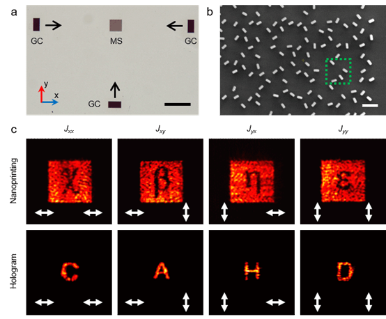 实验上,研究团队借助遗传算法将四幅纳米打印图像和四幅全息图像对应的复振幅分布加载到琼斯矩阵的四个元素上,并成功制备了相应的片上超构表面(图3a-b)。在沿+x和+y方向的导波照明下,经水平和垂直线偏振片分析,导模辐射在近场呈现四个希腊字母图像,同时在远场投影出四个英文全息字母(图3c),充分展示了琼斯矩阵全参数调制功能。