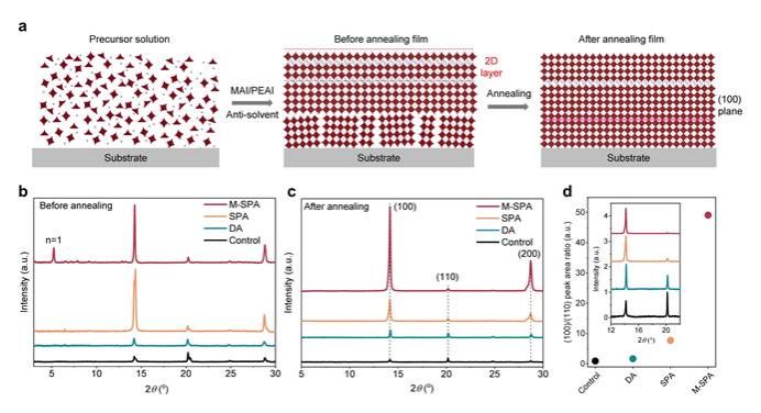 图1. DA、SPA和M-SPA钙钛矿薄膜的形成过程。a, M-SPA钙钛矿成膜过程示意图。b, DA,SPA和M-SPA钙钛矿前驱体薄膜的XRD。c-d, 退火后的DA,SPA和M-SPA钙钛矿薄膜的XRD (c)和(100)/(110)峰比值(d)。插图:退火后薄膜的归一化XRD图。