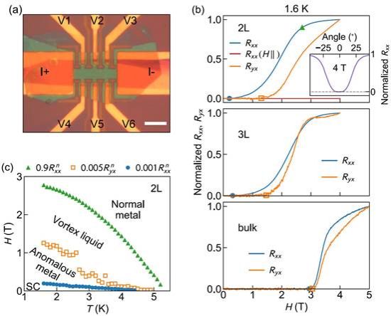 图1. (a)典型器件照片。(b) 不同厚度样品纵向与霍尔电阻的磁场依赖。 (c) 双层样品的磁场-温度相图。