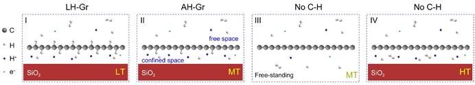 图1. 单面氢化石墨烯的原理图。从左到右依次为:在低温下,衬底上石墨烯在两面形成C-H键;在中等温度时,衬底上石墨烯的限域空间一面进行氢化,自由空间一面不氢化;中等温度时的悬空石墨烯,两面均无C-H键;在高温时,石墨烯两面都不存在C-H键。