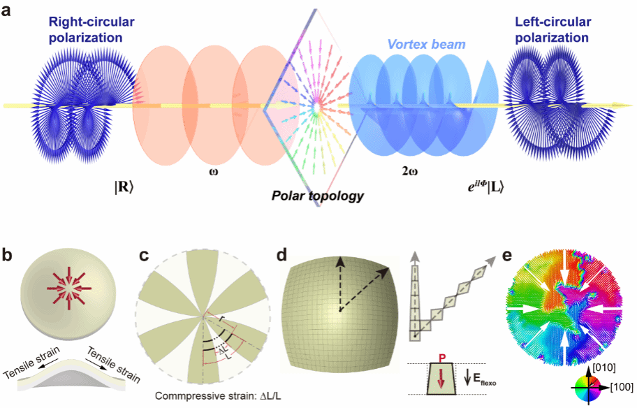 图1.极化拓扑结构的构筑与光场调控示意图。(a)极化拓扑畴调控涡旋光场的示意图。(b-d)穹顶状三维结构形变的产生机理与晶格畸变诱导挠曲电场的原理示意图。(e)结构形变诱导铁电极化的相场模拟。