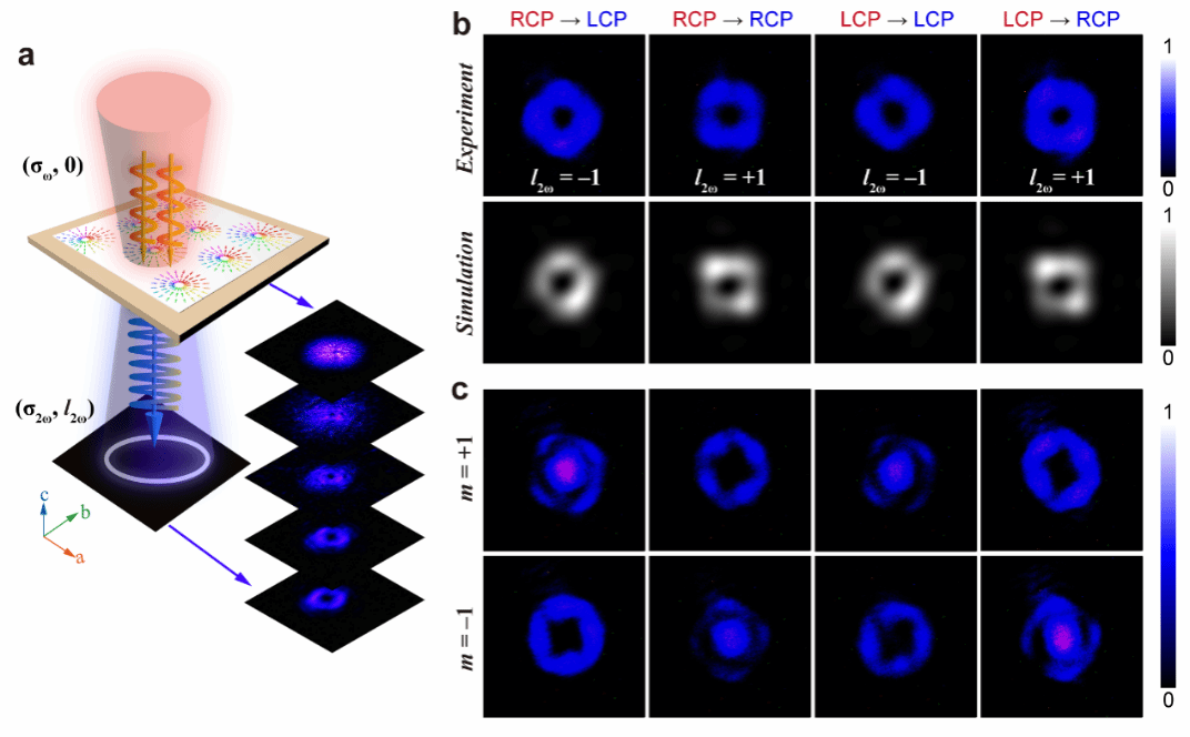 图3.基于中心汇聚型极化拓扑畴的涡旋光场调控。(a)光物质相互作用几何的图示。(b)通过光学自旋-轨道相互作用产生的倍频涡旋光束的实验(第一行)和模拟(第二行)强度分布。(c)涡旋光场对应拓扑荷的表征。