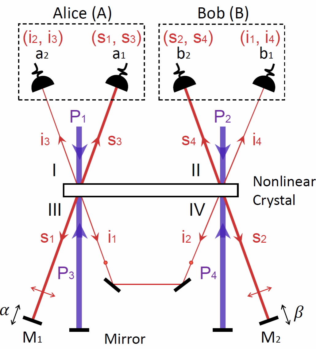 研究团队构建了四光子阻挫干涉装置(图1),并通过后选择机制获得四光子直积态。实验中,研究者分别调控两组相位参数(α, β),对应标准贝尔实验中Alice与Bob两侧的测量设定。团队测得关联函数(图2)所对应的CHSH不等式参数S超出经典上限,统计置信度超过4σ。