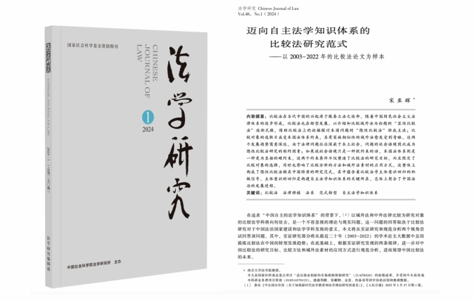 《法学研究》杂志2024年第1期刊载了我校法学院教授宋亚辉有关“自主法学知识体系”的最新研究成果,文章题目为《迈向自主法学知识体系的比较法研究范式》。2003-2022年间,法学类权威期刊(CLSCI-15)共发表了28897篇学术论文。以一定的标准,可被判定为比较法研究的论文共计4884篇,本文以这些论文为样本,从中探寻比较法在中国的研究范式和发展趋势。