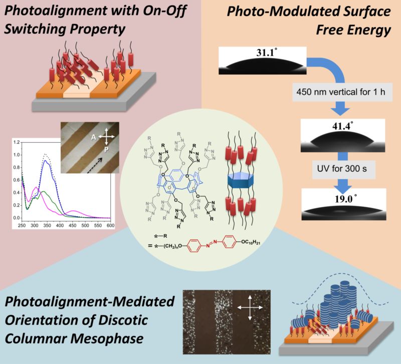 基于偶氮苯的光响应材料(Photoresponsive materials, PRMs)可广泛应用于光控载药与基因转染、光驱动的微机械运动以及智能表面等诸多领域。常规的有机小分子偶氮苯衍生物在溶液中呈现光致顺反异构化或光致变色现象,但是由于分子间强的平行聚集现象(H-aggregation),在体相或固态薄膜状态时光响应显著减弱甚至完全被抑制。其中一重要策略是将偶氮苯作为侧基引入聚合物,由于聚合物的优异成膜性以及主链提供的自由体积使得偶氮苯聚合物薄膜或其体相材料呈现良好的光响应特征,但合成高分子固有的分子量多分散性给其组成带来某些不确定性。该项研究首次通过简单的Click反应高效率地将偶氮苯介晶基元对称地引入柱[5]芳烃,制备了4个和10个亚甲基间隔基的分子量分别为5507和6349的两种结构组成明确的大环柱芳烃偶氮苯液晶齐聚物,表现出优异的成膜性和室温溶液加工特点。由于柱[5]芳烃大环提供的充足自由体积,其体相材料及固态薄膜呈现快速光响应特征和优异的可回复循环特点(图1)。通过偏振光或非偏振光化性光的垂向或倾斜一定角度辐照可以实现图案化的表面制备以及表面自由能、湿润性等的方便调控(图2),甚至通过偶氮苯的光控取向可诱导盘状分子柱状相的取向排布(图3),实现智能表面控制或应用于光电材料领域。