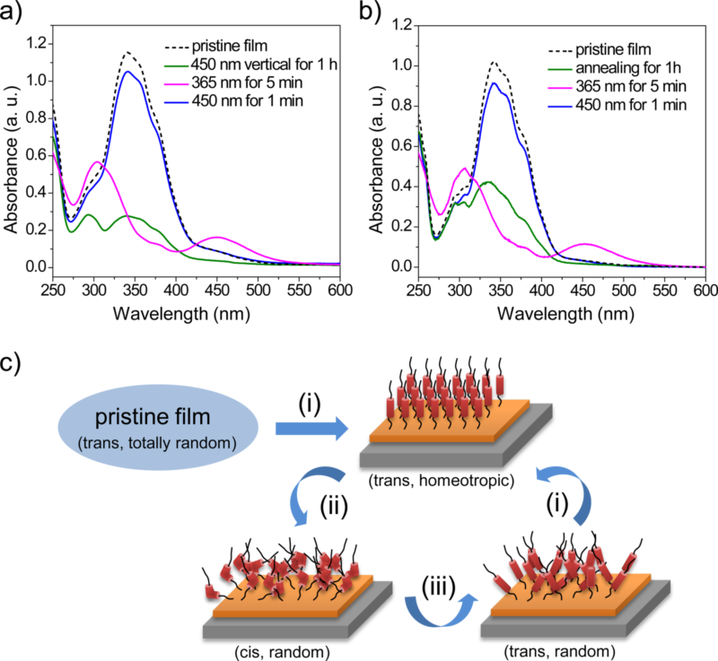 图1、光照或热处理驱动柱[5]芳烃偶氮苯薄膜可逆顺反异构化