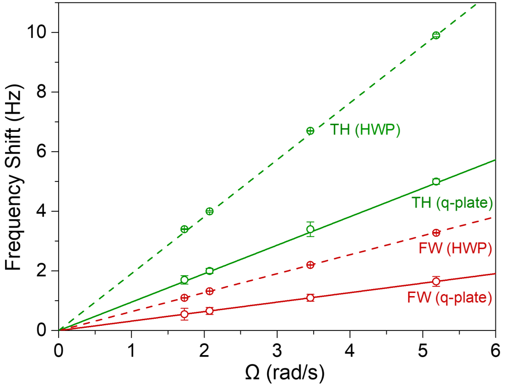 3. 实验测得的不同转速下基频光和三倍频光的旋转多普勒频移虚线为旋转半波片理论预期,实线为旋转q-(q=1/2)理论预期圆圈为实验结果,可以看出上转换光的频移与相应的基频光满足很好的三倍对应关系。